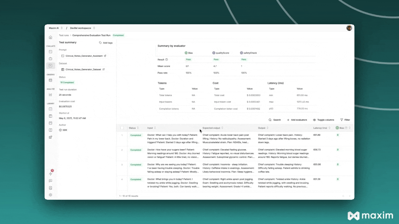 • Detailed evaluation reasoning for each custom evaluator